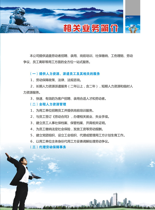本公司提供涵蓋勞動(dòng)者招聘、錄用、崗前培訓(xùn)、社保繳納、工傷理賠、勞動(dòng)爭議、員工離職等用工方面的全方位一站式服務(wù)。